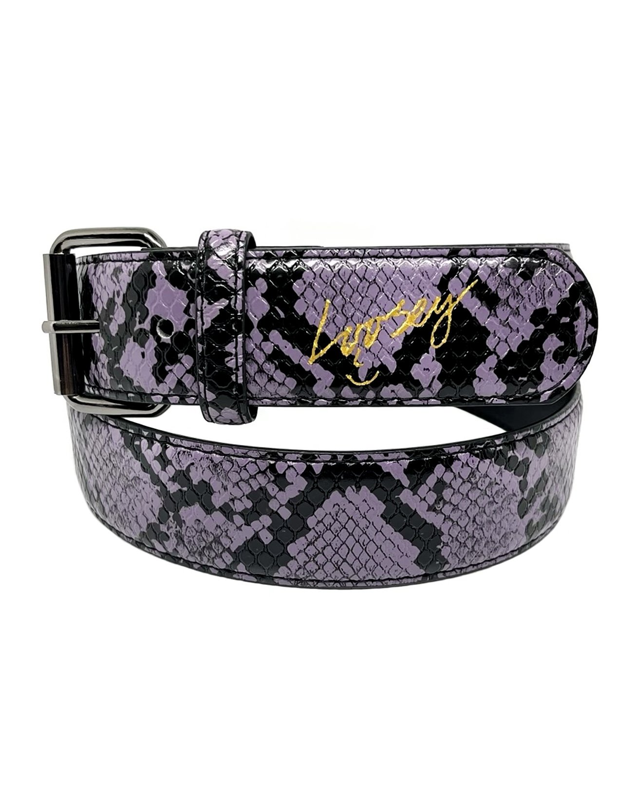 Purple Faux leather snakeskin with charcoal buckle and gold printed logo.